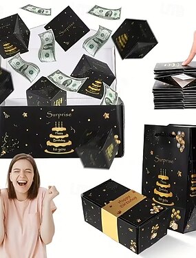 Подарочная коробка-сюрприз на день рождения с деньгами и конфетти — забавный дизайн с эффектом всплывания, черная с золотыми акцентами, идеально подходит для дня рождения или особого случая, подарочная коробка для праздника.