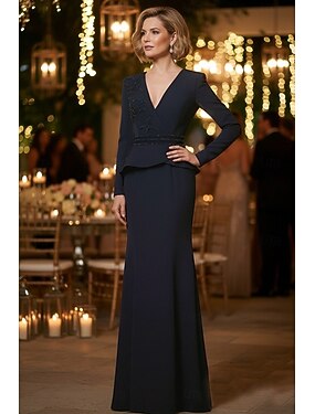 Футляр В пол Вечернее платье Выпускные платья Вечернее платье С пышной юбкой Торжественное платье Элегантный стиль Винтаж Длинный рукав V-образный вырез Свадьба Официальные Стретч-креп с Бусины Оборки