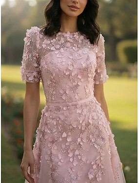 А-силуэт Ниже колена коктейльные платья Элегантный стиль Винтаж С цветами С короткими рукавами Вырез под горло Свадьба Официальные Розовое платье Кружева Тюль с Вышивка бисером Аппликации