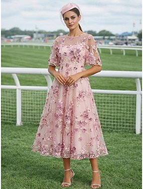 А-силуэт Платья До щиколотки Ниже колена Длинное платье Платье для вечеринки Коктейльные платья Платье для матери невесты С короткими рукавами Рукав до локтя Вырез под горло Иллюзионный декор