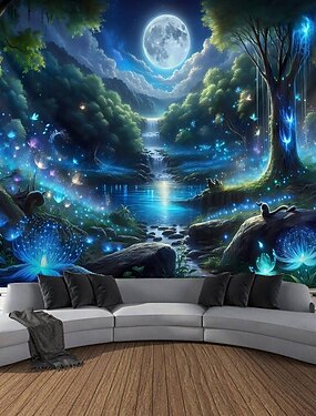мистический биолюминесцентный лес, полнолуние, водопад, настенный гобелен, голубой лунный свет, зачарованный волшебный сад, светящиеся цветы, подвесные украшения для игровой комнаты, спальни, детской,