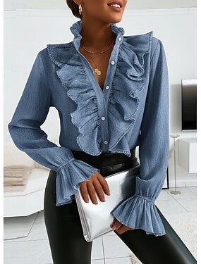 Рубашка Блуза Жен. Белый Розовый Синий Полотняное плетение Оборки кнопка Для улицы Повседневные Мода Воротник-стойка Стандартный S