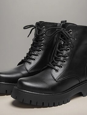 Черные мужские военные ботинки из искусственной кожи на шнуровке с прочной подошвой, массивным дизайном и стилем милитари — идеально подходят для байкеров, поклонников панк-рока и любителей повседневной носки на свежем воздухе.