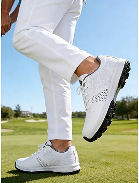 Белые мужские туфли для гольфа, легкий дышащий верх, амортизирующая подошва с хорошим сцеплением, спортивный современный стиль, идеально подходят для игроков в гольф и активного отдыха на природе.