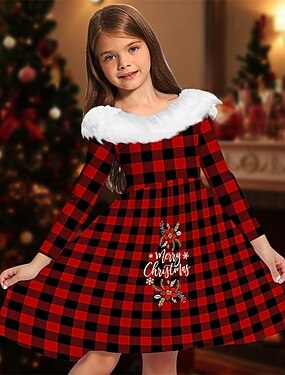 Новогодняя тематика Девушки ' 3D Цветочный принт Графика В клетку Платье Длинный рукав Весна Осень Отпуск Повседневные Праздники Красивый Милая Дети 4-12 лет Платье для вечеринки Платье A-силуэта