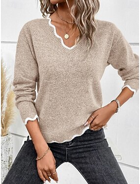 Жен. Вязаная ткань Пуловер Свитер На каждый день Мягкий Чистый цвет Кабель V-образный вырез Трикотаж Длинный рукав Обычные топы Вязать на открытом воздухе Повседневные выходные Верблюжий Лиловый