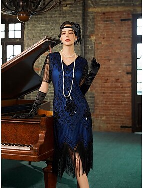 Бурные 20-е 1920-е годы До колена Платье для флаперов Инвентарь Коктейльные платья Короткие рукава Великий Гэтсби Девушка-обманщик Свадебный гость Пайетки Бахрома V-образный вырез Маскарадный костюм