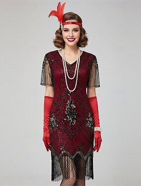 Набор Бурные 20-е 1920-е годы До колена Платье для флаперов Инвентарь Коктейльные платья с аксессуарами Без рукавов Великий Гэтсби Девушка-обманщик Свадебный гость Пайетки Бахрома V-образный вырез