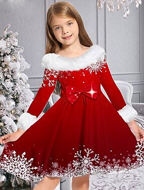 Дети Девочки Платья к Новому году Платье Платье-снежинка Новогодняя ёлка Буквы В снежинку Длинный рукав Новогодние подарки Повседневные Меховая оторочка Crewneck Очаровательны Повседневные Полиэстер