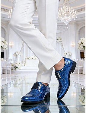 Мужские синие лакированные туфли без шнурков с крокодиловым принтом — элегантная формальная обувь для деловых встреч, вечерних мероприятий и свадеб.