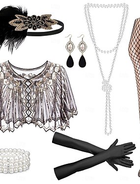 Набор Элегантный стиль Винтаж 1920-е годы Перчатки Ожерелья Обруч в стиле флэппер с аксессуарами Великий Гэтсби Свадебный гость Перо Бусины Мода Маскарадный костюм Жен. Новый год Маскарад