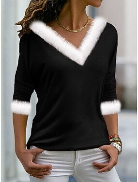 Новогодняя тематика Жен. Блуза Сплошной цвет Стиль На каждый день Длинный рукав V-образный вырез Обычные топы Повседневные Пэчворк Черный Красный Весна Осень Зима