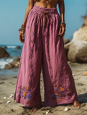 Жен. Беллое дно Брюки Мода Богемный Полная длина Средняя талия Цветы Эластичная талия Рисунок На открытом воздухе Удобный Праздники На выход Красновато-лиловый Оранжево-красный Черный Розовый Лето