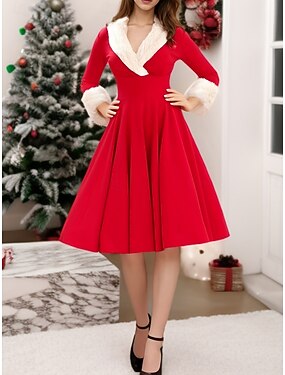 Новогодняя тематика Жен. Платье средней длины Платье A-силуэта На каждый день Повседневные Свидание На выход Стандартный Полотняное плетение Рукав 3/4 V-образный вырез Черный Белый Красный