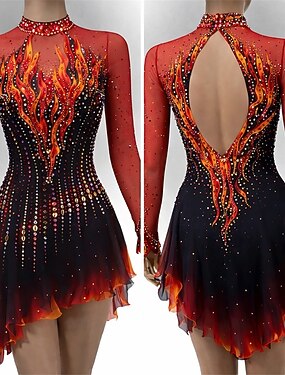Платье для фигурного катания Жен. Катание на коньках Платья Красный Пэчворк Открытая спина Эластичная Учебный Соревнование Одежда для фигурного катания Классика Стразы Длинный рукав