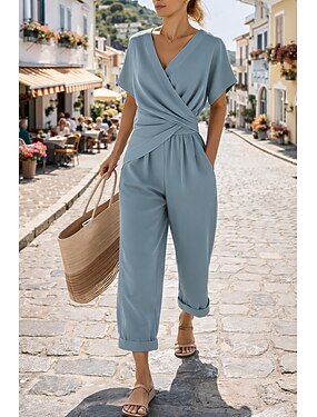 Жен. Комплекты брюк Болеро Топ С короткими рукавами V-образный вырез Полотняное плетение Рюши Элегантный стиль Мода Уличный стиль Повседневные на открытом воздухе Офис Синий Хаки Бежевый Лето