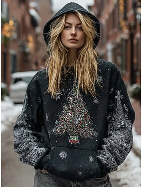 Рождественский женский пуловер с ёлкой и снежинками худи свитер графический повседневный с длинным рукавом с капюшоном обычные топы вечерняя одежда уличная повседневная одежда черный весна осень зима