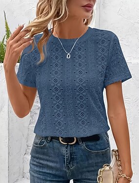 Жен. Футболки с вышитой глазурью Сплошной цвет Винтаж Стиль На каждый день С короткими рукавами V-образный вырез Обычные топы Повседневные На выход Черный Белый Пыльно-синий Лето Весна