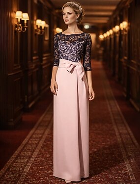 Футляр В пол Свадебное платье для гостей Вечернее платье Платье для матери невесты Рукав 3/4 Круглый вырез Элегантный стиль Свадебный гость Сатин Кружева с Бант(ы)