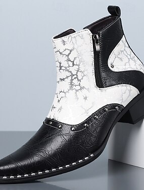 Мужские черно-белые ковбойские сапоги в стиле вестерн с боковой молнией и острым носком — идеальный вариант для стильных мужчин, подходящих для музыкальных фестивалей, вечеринок, выступлений на сцене и модных образов.