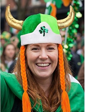 Женская шапка викинга на День Святого Патрика с золотыми рогами и заплетенными оранжевыми волосами, зеленая шапка-клевер для ирландских парадов и фестивалей. &наряды для вечеринки