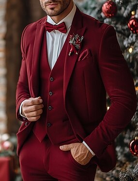 Мужской Для вечеринок Повседневные Костюмы для вечеринок Лацкан с острым углом Бордовый Рождество Повседневные Однотонный Узкий крой Набор из 3 предметов Однобортный с 2 пуговицами