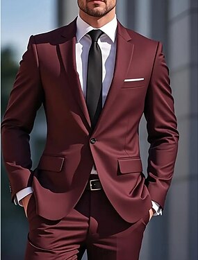 Мужской Свадьба Бизнес Костюмы для вечеринок Лацкан с тупым углом Бордовый Формальная Однотонный Приталенный крой Набор из 2 предметов Однобортный с 1 пуговицей