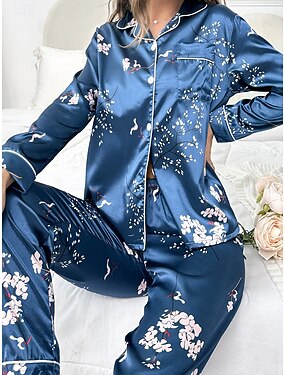 Жен. Домашняя одежда пижама Мода Простой На каждый день Графика Шелковая атласная пижама Эластичная талия Брюки Дом Отпуск Длинный рукав Рубашечный воротник Синий Лето Весна Осень Стандартный