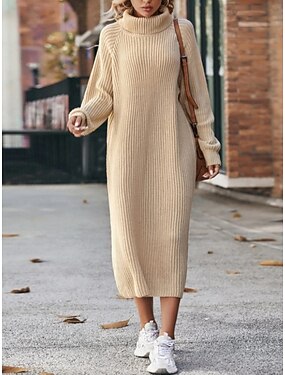 Жен. Вязаная ткань Платье-свитер Элегантный стиль На каждый день Мягкий Чистый цвет Рельефный узор Хомут Бусины Трикотаж Длинный рукав Длинные топы Вязать на открытом воздухе Повседневные выходные