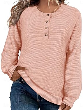 Жен. Вязаная ткань На каждый день Мягкий Чистый цвет Рельефный узор Вырез под горло Пуговицы Трикотаж Длинный рукав Обычные топы Вязать на открытом воздухе Повседневные выходные Черный Розовый