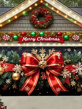 Новогоднее покрытие для гаражных ворот 2025 красный бант и зеленая гирлянда из сосны фон для праздника уличное украшение гаража для зимнего двора и вечеринки