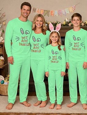 Семейный вид Пасха Пижамы Графика Кролик Повседневные С принтом Зеленый Длинный рукав Отпуск Подходящие наряды