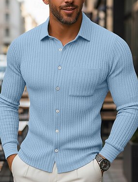 Муж. Рубашка Ребристый трикотаж Повседневная рубашка Кнопка рубашка Синий Белый Темно синий Серый Длинный рукав Полотняное плетение Воротничок Повседневные На выход Карман Одежда