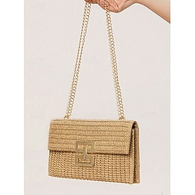 женская сумка через плечо из плетеной соломы с золотым ремешком-цепочкой – элегантный летний клатч для пляжных, отпускных и курортных образов