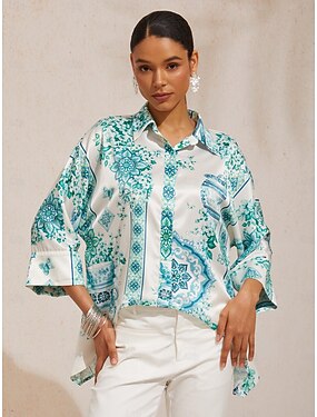 Жен. Мужской Рубашка на пуговицах Повседневная рубашка Повседневные Как у футболки Абрикосовый Пуговицы С принтом С короткими рукавами Элегантный стиль Богемия Отпуск Рубашечный воротник Лето