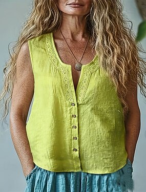 Жен. Жилет из хлопка и льна Кружевной топ Летние вершины Блуза Рюши Кружева Пэчворк Полотняное плетение Элегантный стиль Богемия Винтаж Без рукавов V-образный вырез Обычные топы