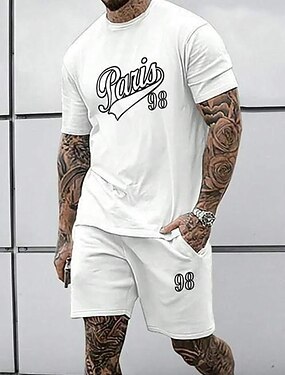 Муж. Текст / Количество 2шт Наборы футболок Летние вершины С короткими рукавами Короткие штаны Вырез под горло Спорт На каждый день на открытом воздухе Отпуск спорт 3D печать Лето Белый