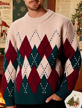 Муж. Рождественский джемпер Рождественские свитера Праздничный свитер Пуловер Свитер Вязаный свитер Рельефный узор Вязать Обычные топы Трикотаж Ромб Вырез под горло Мода Классический