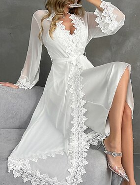 Жен. Халат Теплый Мода На каждый день Чистый цвет Шелковая атласная пижама Кружева Платья Дом Кровать Длинный рукав Вырез под горло Белый Лето Весна Стандартный