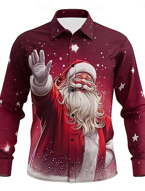 Новогодняя тематика Муж. Дед Мороз 3D в мультяшном стиле Человеческое лицо Рубашка Кнопка рубашка Длинный рукав Веселая на открытом воздухе Праздники Весна Осень Отложной 3D