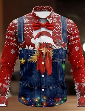 Новогодняя тематика Муж. Петух Рождественское животное Новогодние костюмы Рубашка Кнопка рубашка Длинный рукав Веселая на открытом воздухе Праздники Весна Осень Отложной 3D печать рубашки с воротником