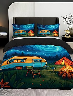 Комплект из 3 пуховых пододеяльников с изображением костра и автомобиля для кемпинга, звездное небо, для двуспальной кровати, мягкий пододеяльник с 2 наволочками – роскошное постельное белье для