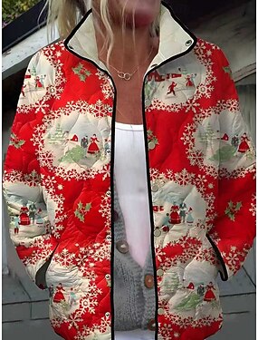 Жен. Зимняя куртка Стеганая куртка Сохраняет тепло Легкость Пуговицы С принтом Активный Винтаж Художественный На каждый день Дед Мороз Повседневные Короткая Воротник-стойка Стандартный Длинный рукав