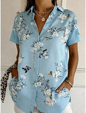Жен. Рубашка Пуговицы С принтом Цветочный принт Графика Винтаж Стиль Современное С короткими рукавами Рубашечный воротник Обычные топы Повседневные Синий Желтый Лиловый Зеленый Лето Весна