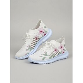 Белые женские кроссовки Flyknit с цветочным принтом – дышащая, легкая спортивная обувь, повседневные кроссовки для прогулок, путешествий, спортзала и повседневной носки.