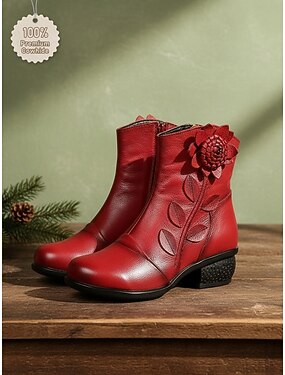 Женские красные кожаные ботильоны с цветочной аппликацией – винтажные короткие сапоги на среднем каблуке для повседневных и нарядных образов.