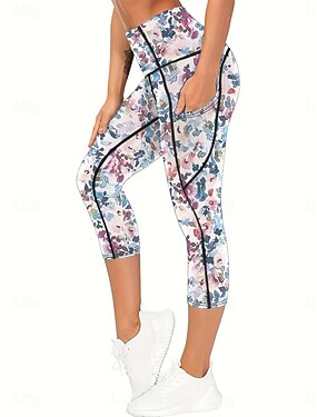 Жен. Штаны для пилатеса Штаны для йоги Завышенная Укороченные Тренировка в тренажерном зале Бег Фитнес Леггинсы Нижняя часть Цветочные ботанический Черный Белый Желтый Виды спорта Спортивная одежда