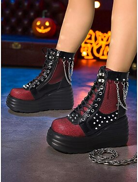 Женские красные байкерские ботинки на платформе с сетчатыми вставками, заклепками и цепями — готические панковские ботинки на шнуровке и высоком каблуке для Хэллоуина, концертов и альтернативной