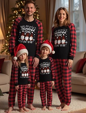 Семейный вид Пижамы В клетку Рождественский образец Дом Пэчворк Красный Длинный рукав Активный Подходящие наряды