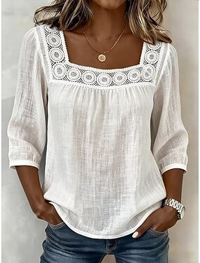 Жен. Блуза Кружева Сплошной цвет Винтаж Повседневные Стиль Рукав до локтя Квадратный вырез Обычные топы Повседневные Синий Черный Белый Розовый Красный Лето Весна